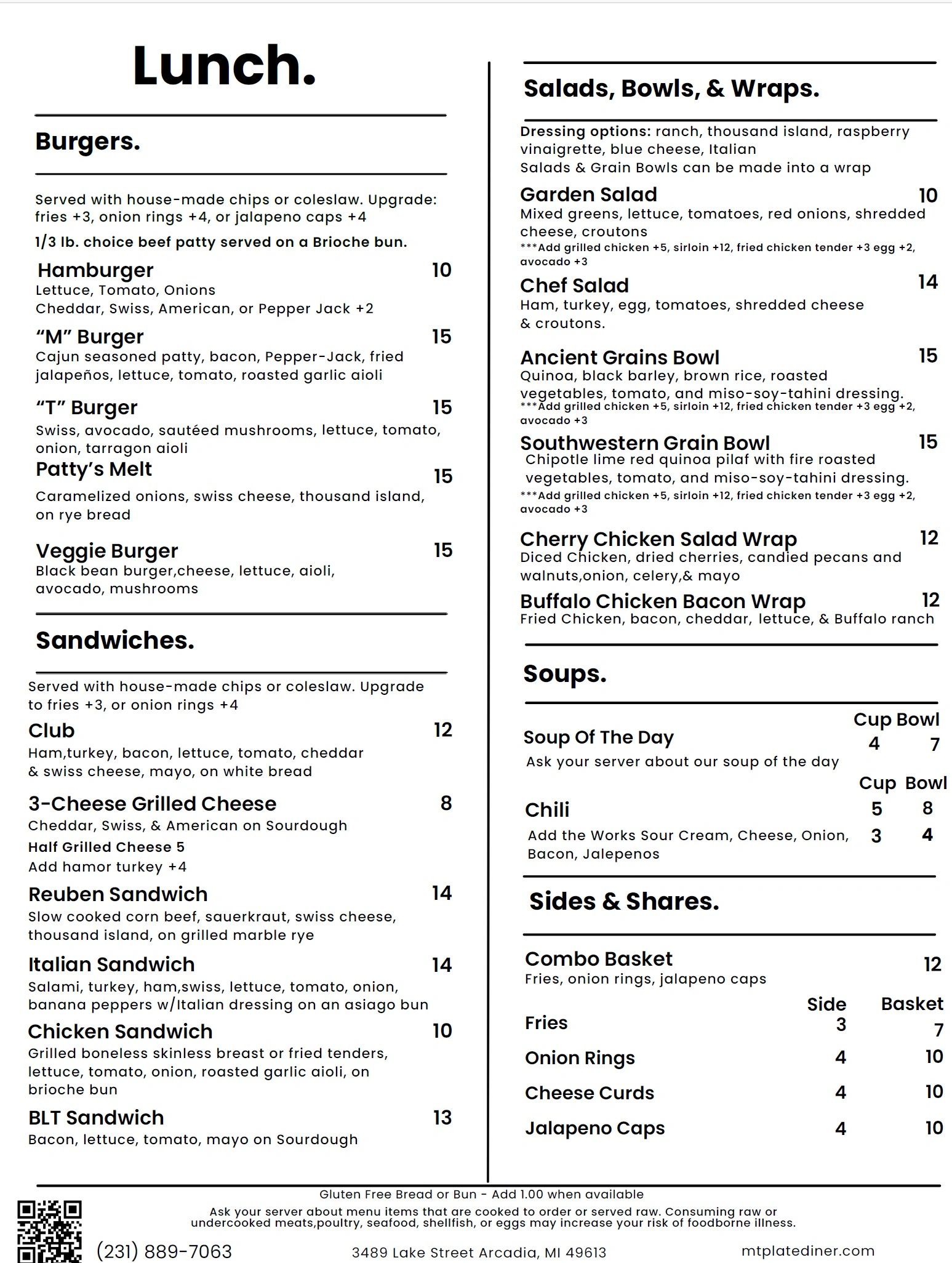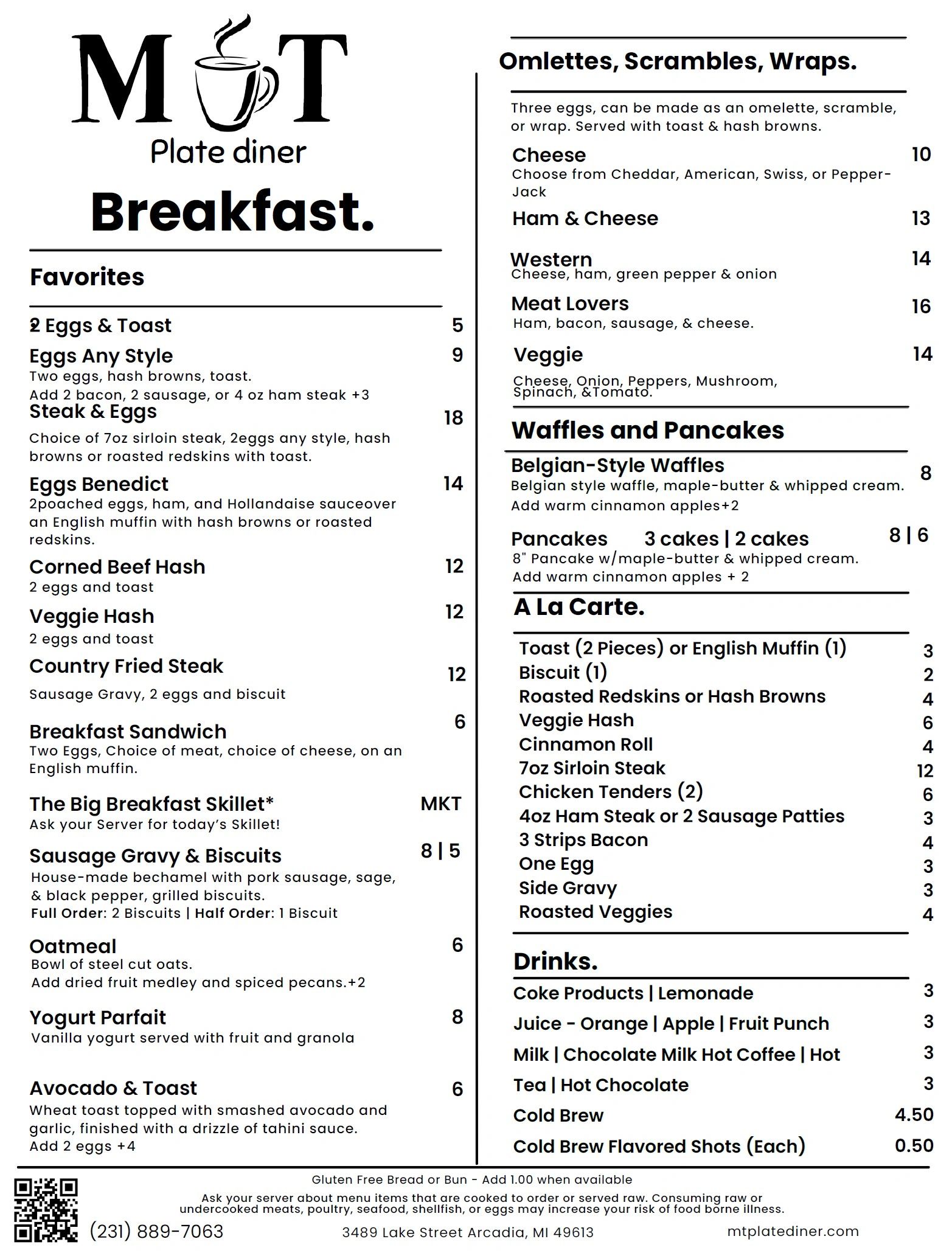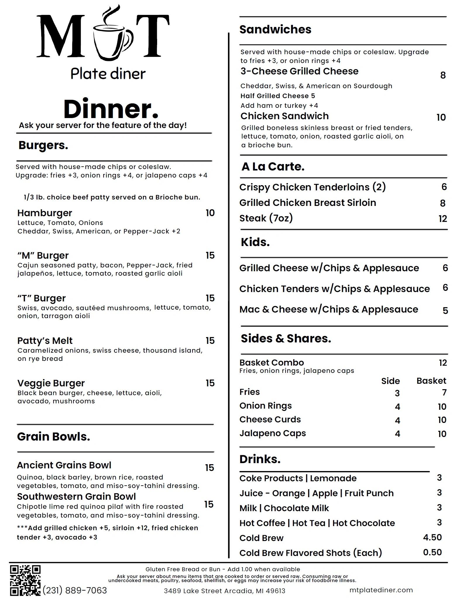 Welcome to the home of The MT Plate Diner located in Beautiful and Historic Arcadia Michigan. We are Matt & Tracy and we hope you appreciate the play on our initials for coming up with the MT (empty) Plate Diner name.